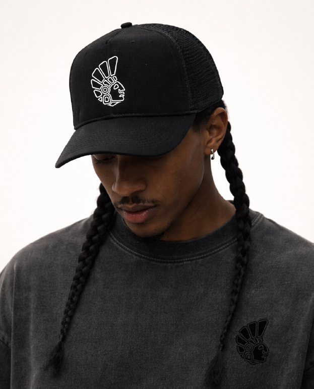 Una pieza que trasciende lo básico. Esta gorra trucker en color negro redefine el minimalismo con un símbolo cargado de identidad: un rostro indígena estilizado, finamente bordado al frente como homenaje a la herencia ancestral reinterpretada en clave contemporánea.